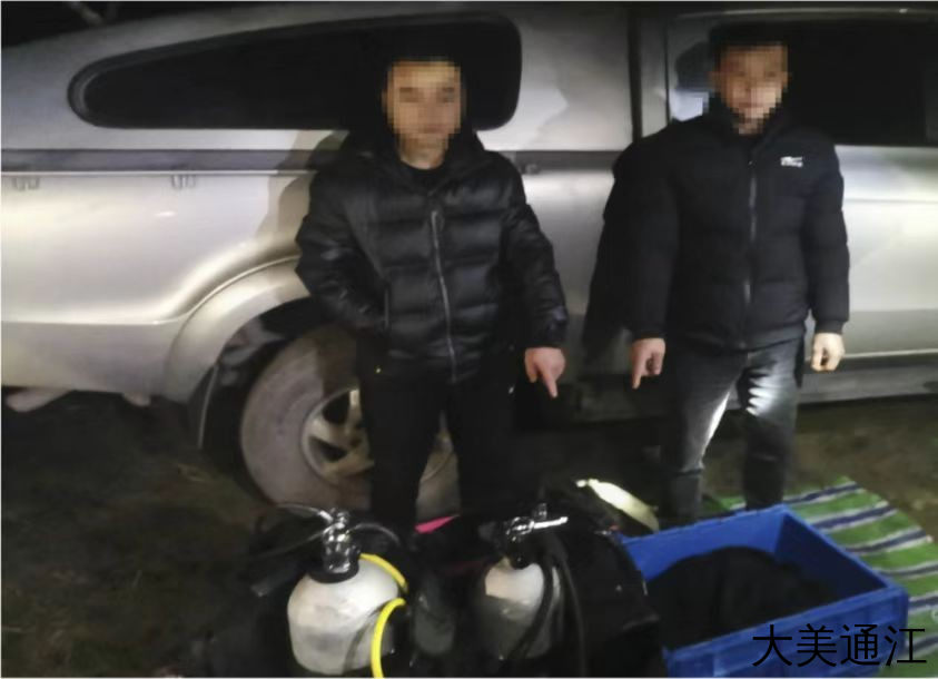 1月26日20时许,两名穿戴专业潜水工具的人员刚从河道内钻出来,就被当场抓获。
