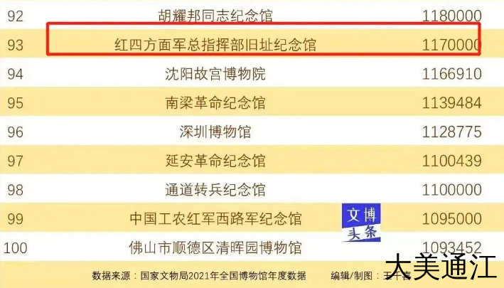 根据国家文物局公开的2021年全国博物馆年度数据,文博头条统计出2021年年度参观量最大的100家博物馆纪念馆。所有上榜的博物馆纪念馆年度参观量均大于100万人次!其中,红四方面军总指挥部旧址纪念馆入围百强。