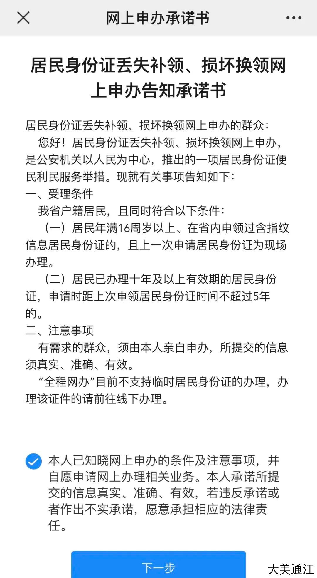 查看办理条件及承诺书内容,确认无误的,选择“本人已知晓……”同时点击“下一步”。