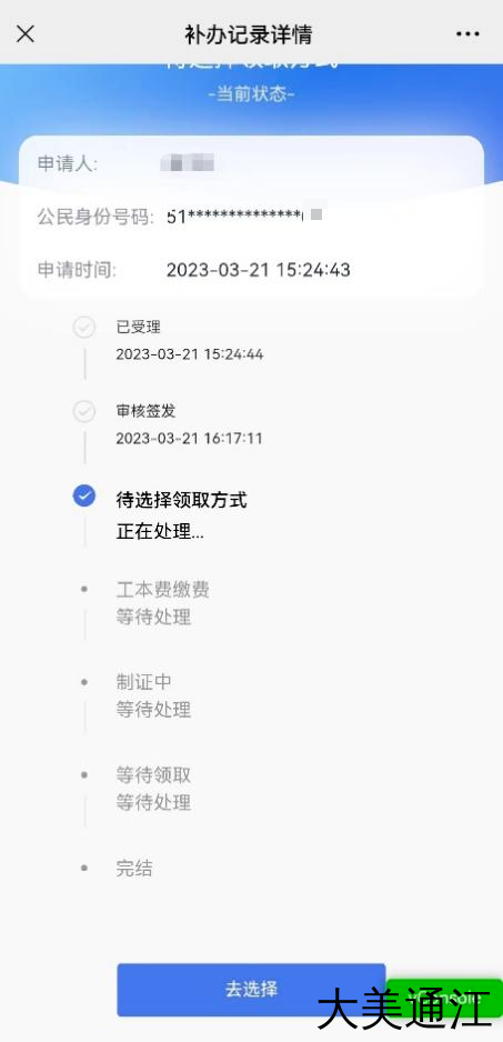 审核通过后,申请人进入首页“查询补办记录”中,找到状态为“领取方式待选择”的申请记录,点击进入后,点击“待选择”。
