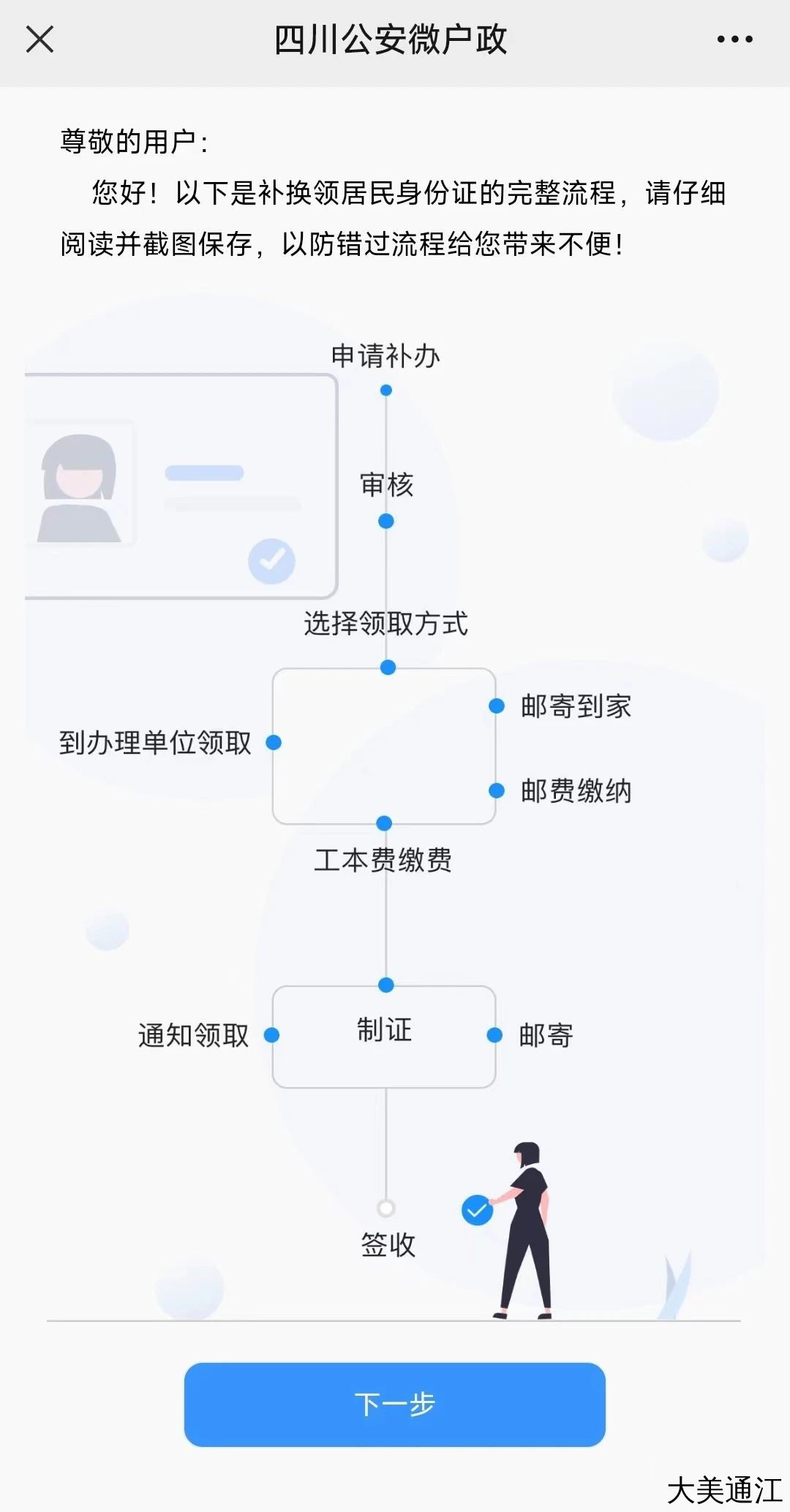 点击“居民身份证补办”进入流程图查看页面,流程确认后点击“下一步”。