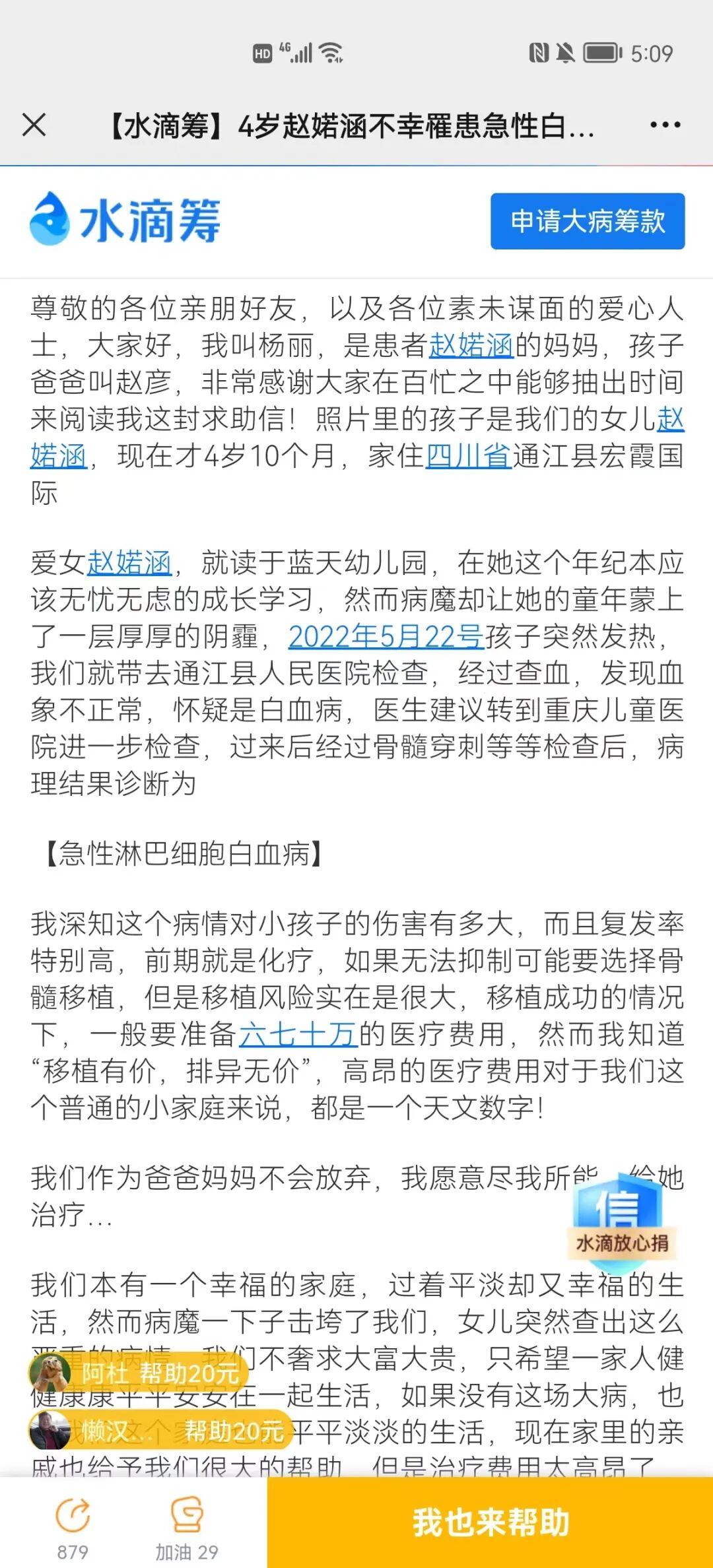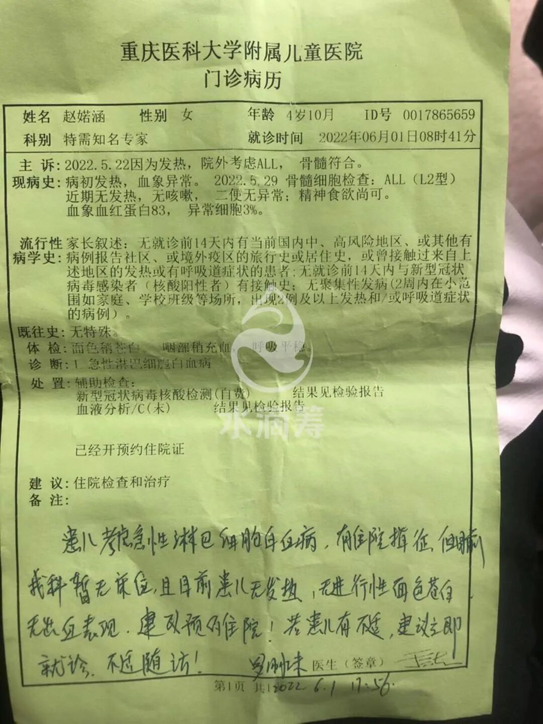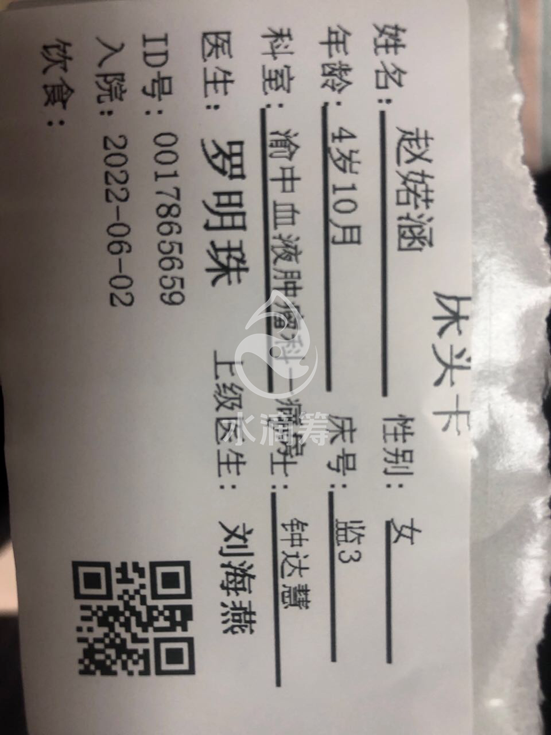 姓名:赵婼涵,性别:女,年龄:4岁,住址:四川省通江县宏霞国际。病症:急性白血病 赵婼涵,就读于蓝天幼儿园,在她这个年纪本应该无忧无虑的成长学习,然而病魔却让她的童年蒙上了一层厚厚的阴霾,2022年5月22日孩子突然发热,去通江县人民医院检查,经过查血,发现血象不正常,怀疑是白血病,医生建议转到重庆儿童医院进一步检查,过来后经过骨髓穿刺等等检查后,病理结果诊断为