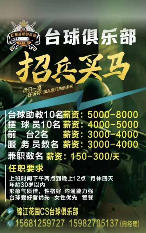 通江CS台球俱乐部招聘,摆球服务员,台球助教等职位,要求女性,月薪7000~20000